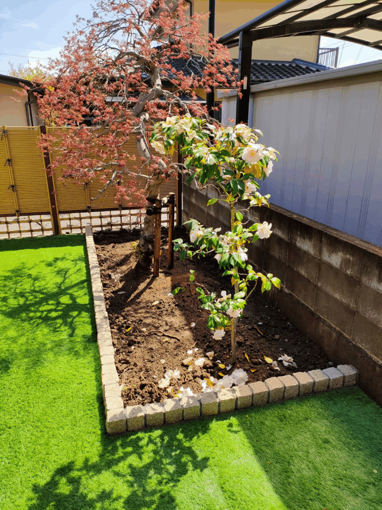 道路側にあったモミジとツバキを南側のお庭に移植し、ピンコロ石で囲いました。